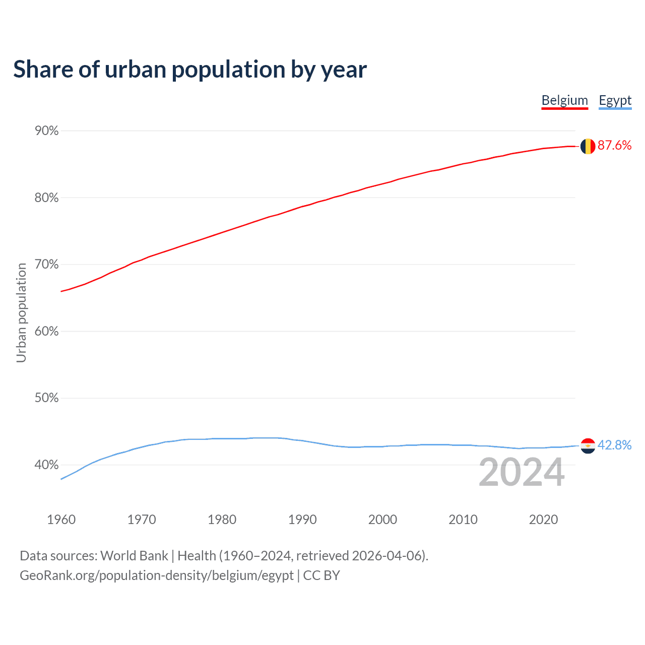 From 2004 to 2024, the share of urban population changed from 83.3% to 87.6% in Belgium and from 42.9% to 42.8% in Egypt.