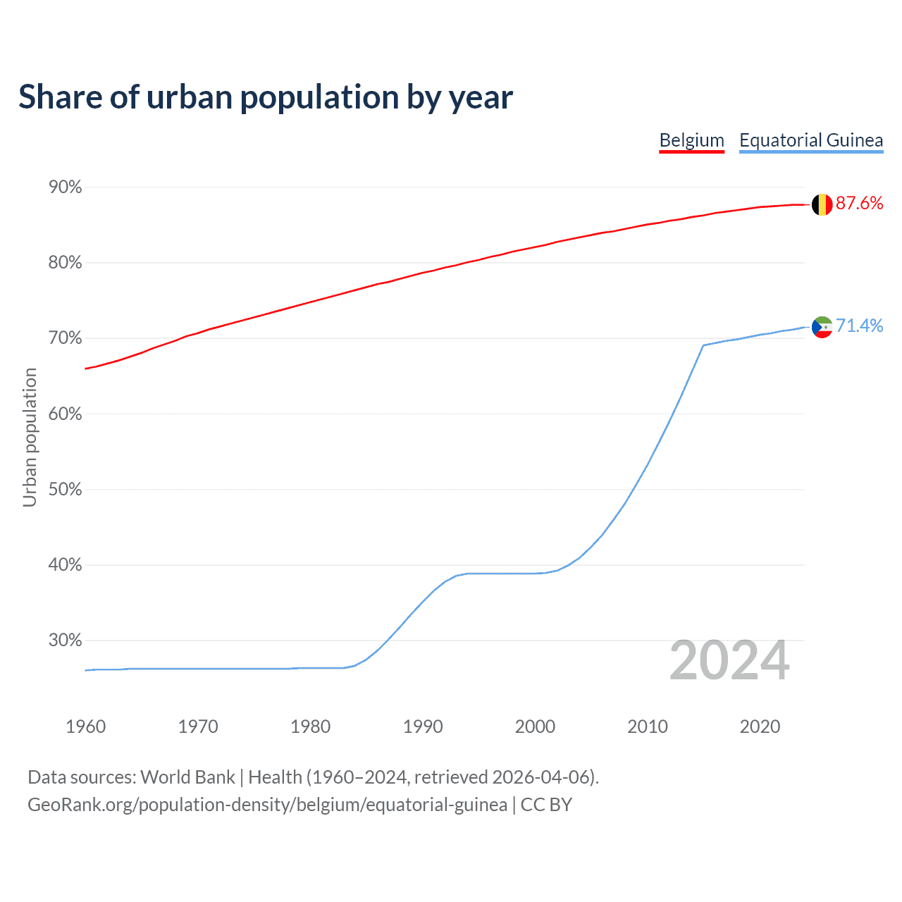 From 2004 to 2024, the share of urban population changed from 83.3% to 87.6% in Belgium and from 40.9% to 71.4% in Equatorial Guinea.