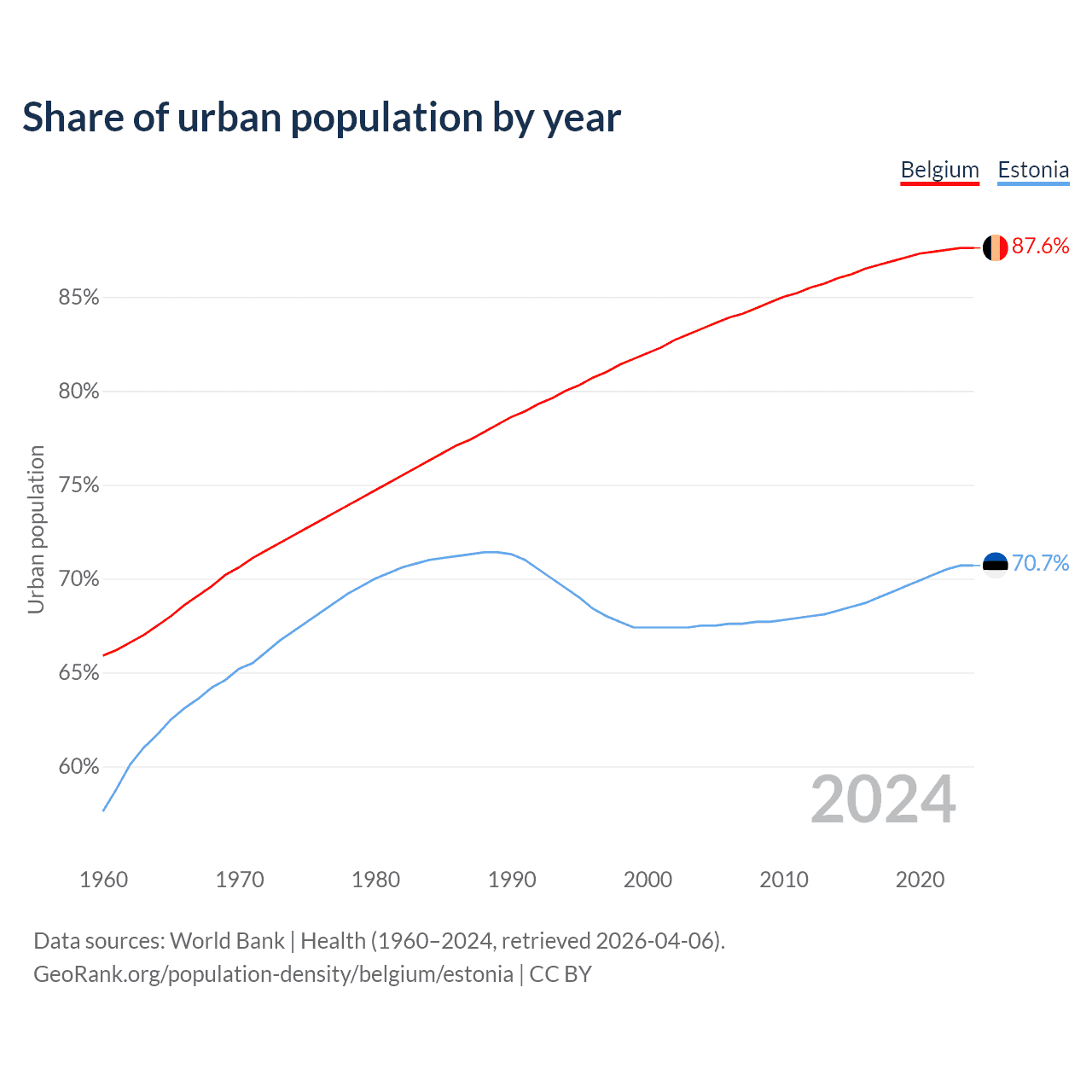 From 2004 to 2024, the share of urban population changed from 83.3% to 87.6% in Belgium and from 67.5% to 70.7% in Estonia.