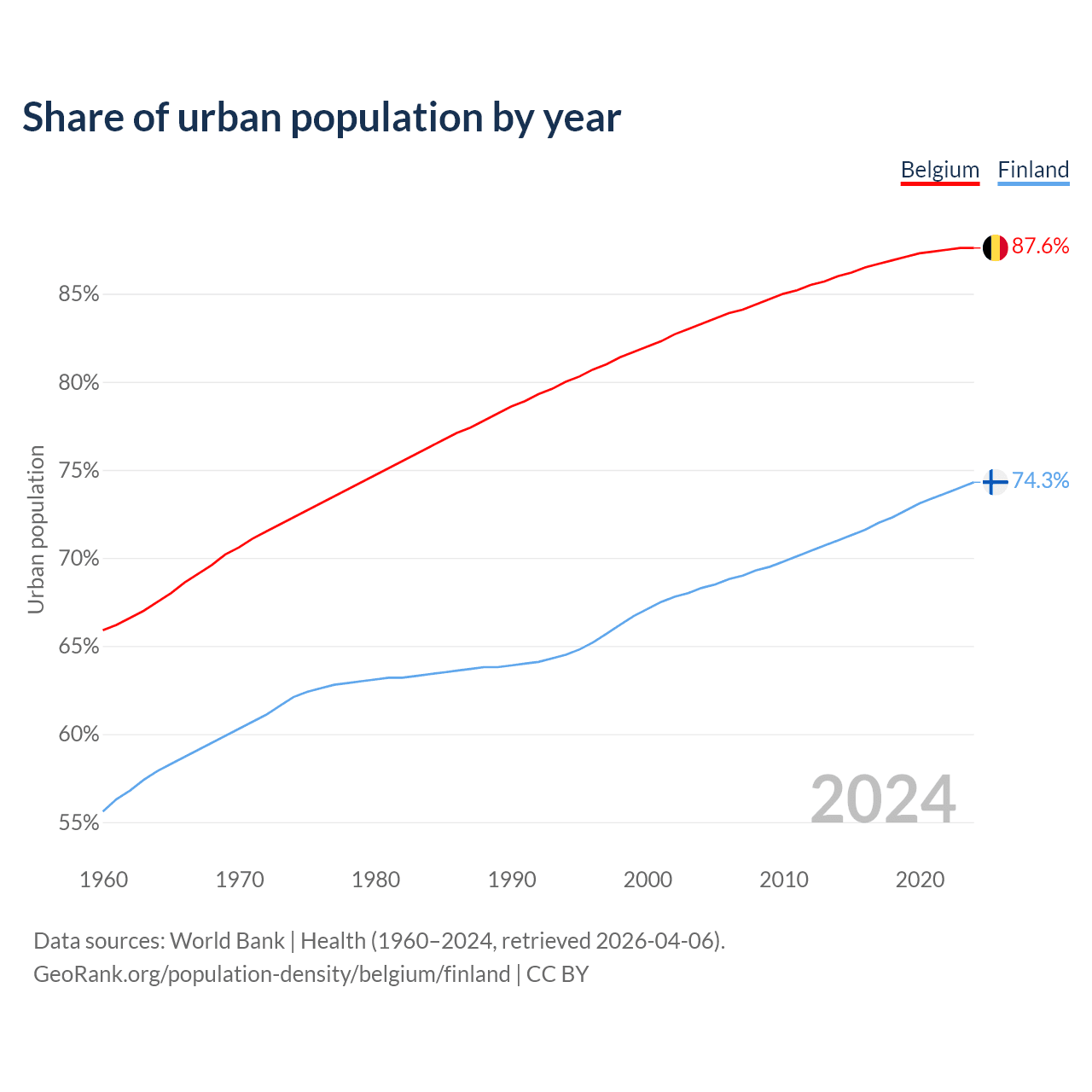 From 2004 to 2024, the share of urban population changed from 83.3% to 87.6% in Belgium and from 68.3% to 74.3% in Finland.