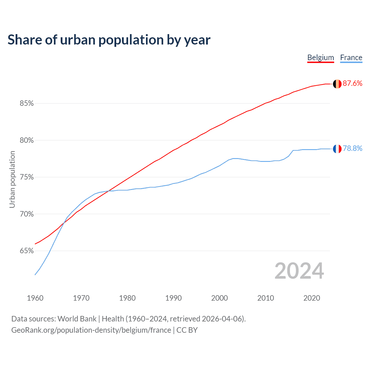 From 2004 to 2024, the share of urban population changed from 83.3% to 87.6% in Belgium and from 77.5% to 78.8% in France.