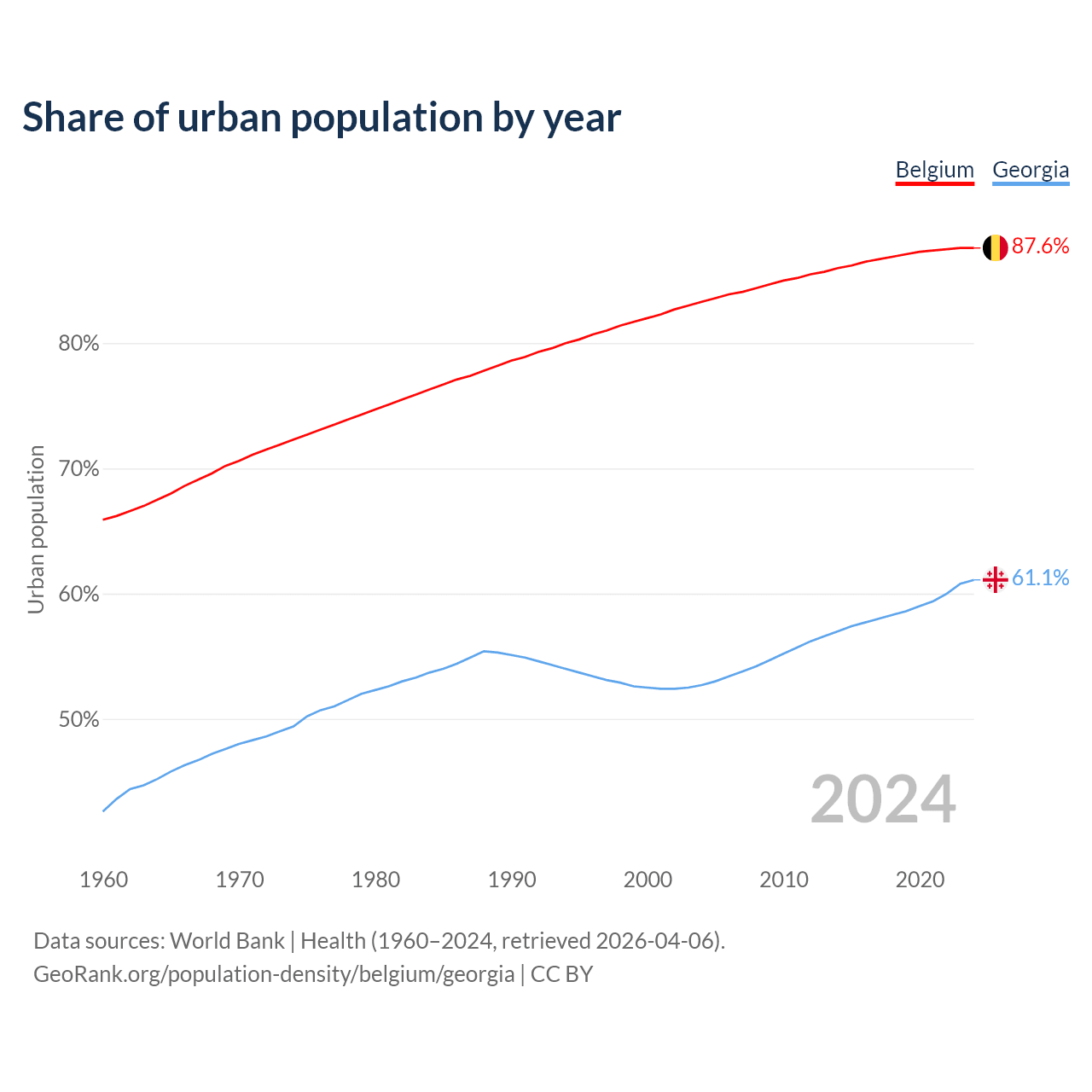 From 2004 to 2024, the share of urban population changed from 83.3% to 87.6% in Belgium and from 52.7% to 61.1% in Georgia.