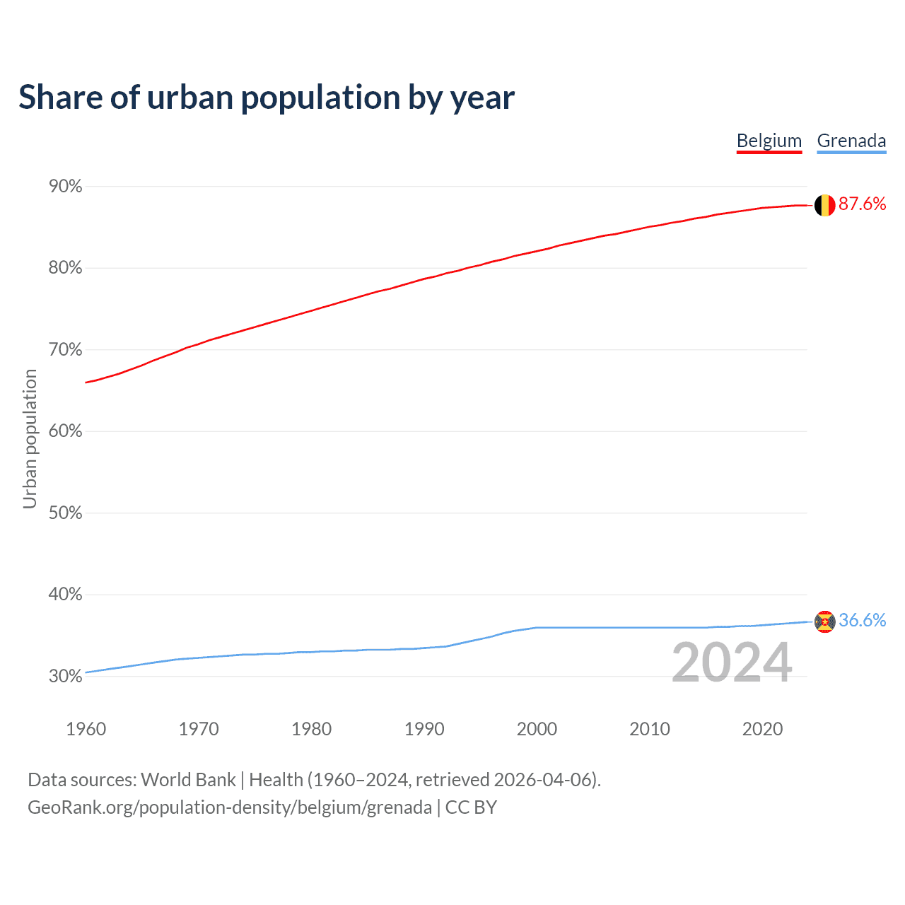 From 2004 to 2024, the share of urban population changed from 83.3% to 87.6% in Belgium and from 35.9% to 36.6% in Grenada.