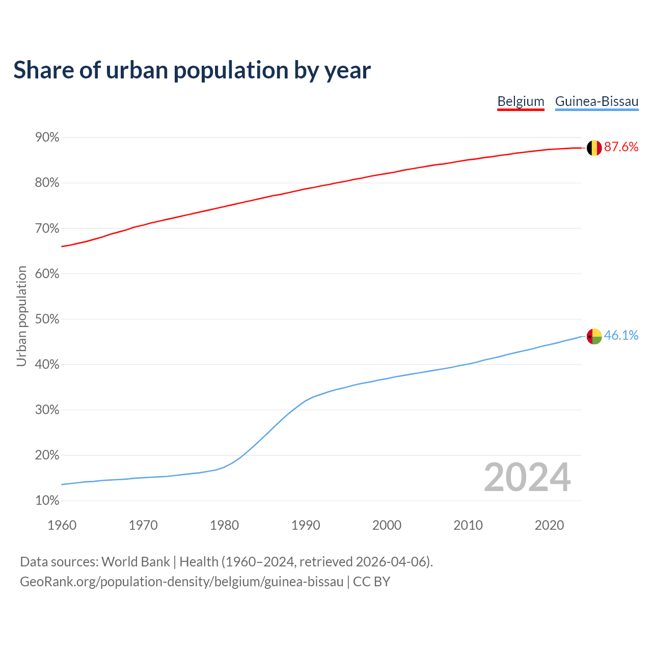 From 2004 to 2024, the share of urban population changed from 83.3% to 87.6% in Belgium and from 38.1% to 46.1% in Guinea-Bissau.