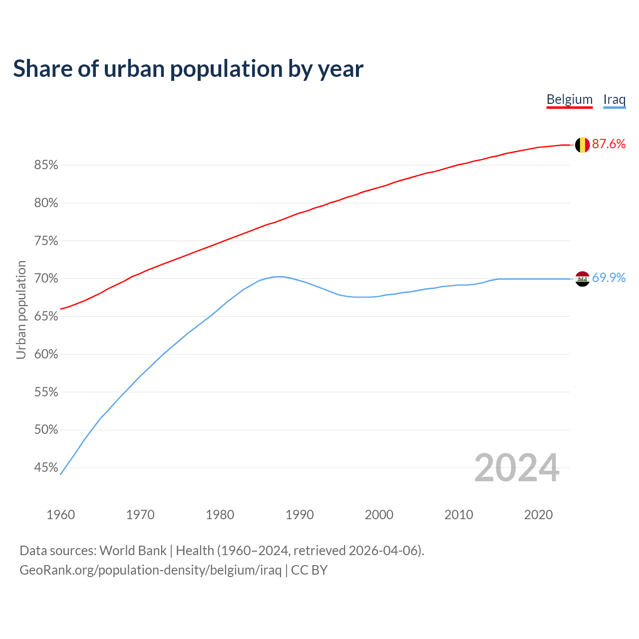 From 2004 to 2024, the share of urban population changed from 83.3% to 87.6% in Belgium and from 68.2% to 69.9% in Iraq.