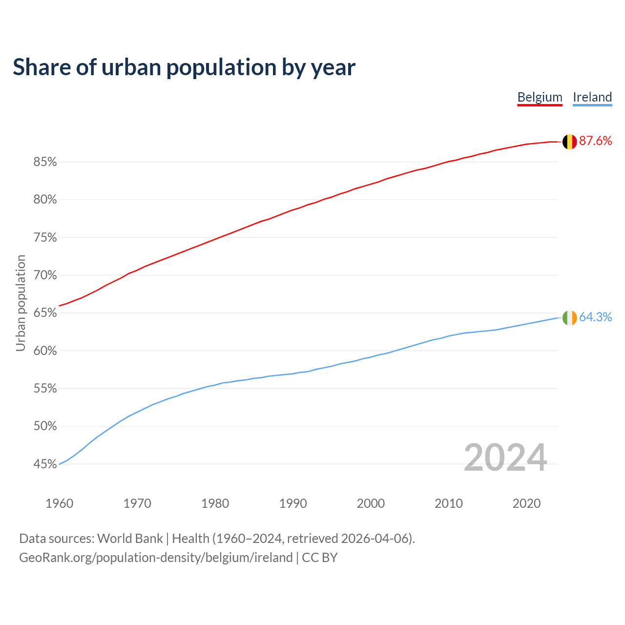 From 2004 to 2024, the share of urban population changed from 83.3% to 87.6% in Belgium and from 60.2% to 64.3% in Ireland.