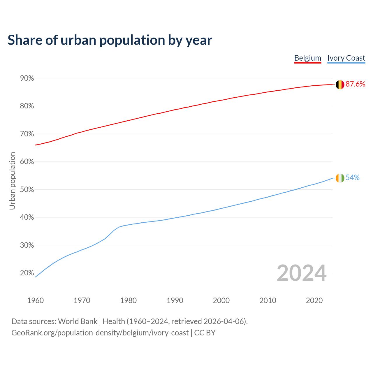 From 2004 to 2024, the share of urban population changed from 83.3% to 87.6% in Belgium and from 44.7% to 54% in Ivory Coast.