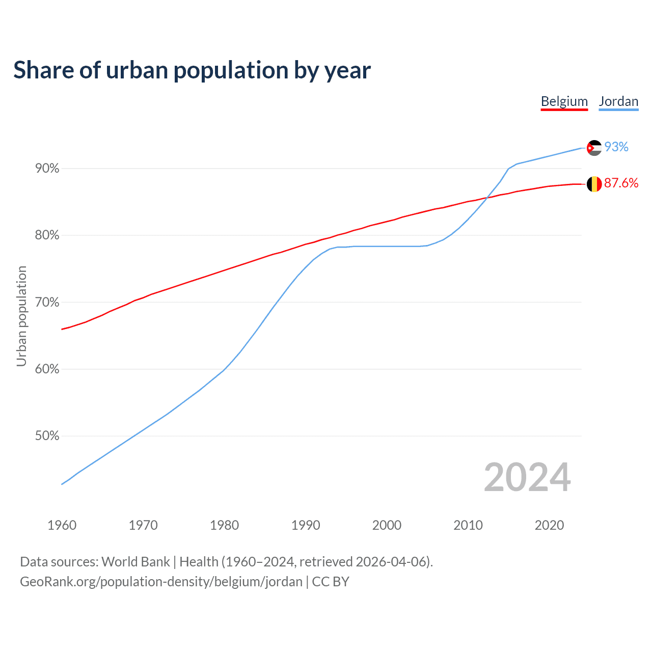 From 2004 to 2024, the share of urban population changed from 83.3% to 87.6% in Belgium and from 78.3% to 93% in Jordan.