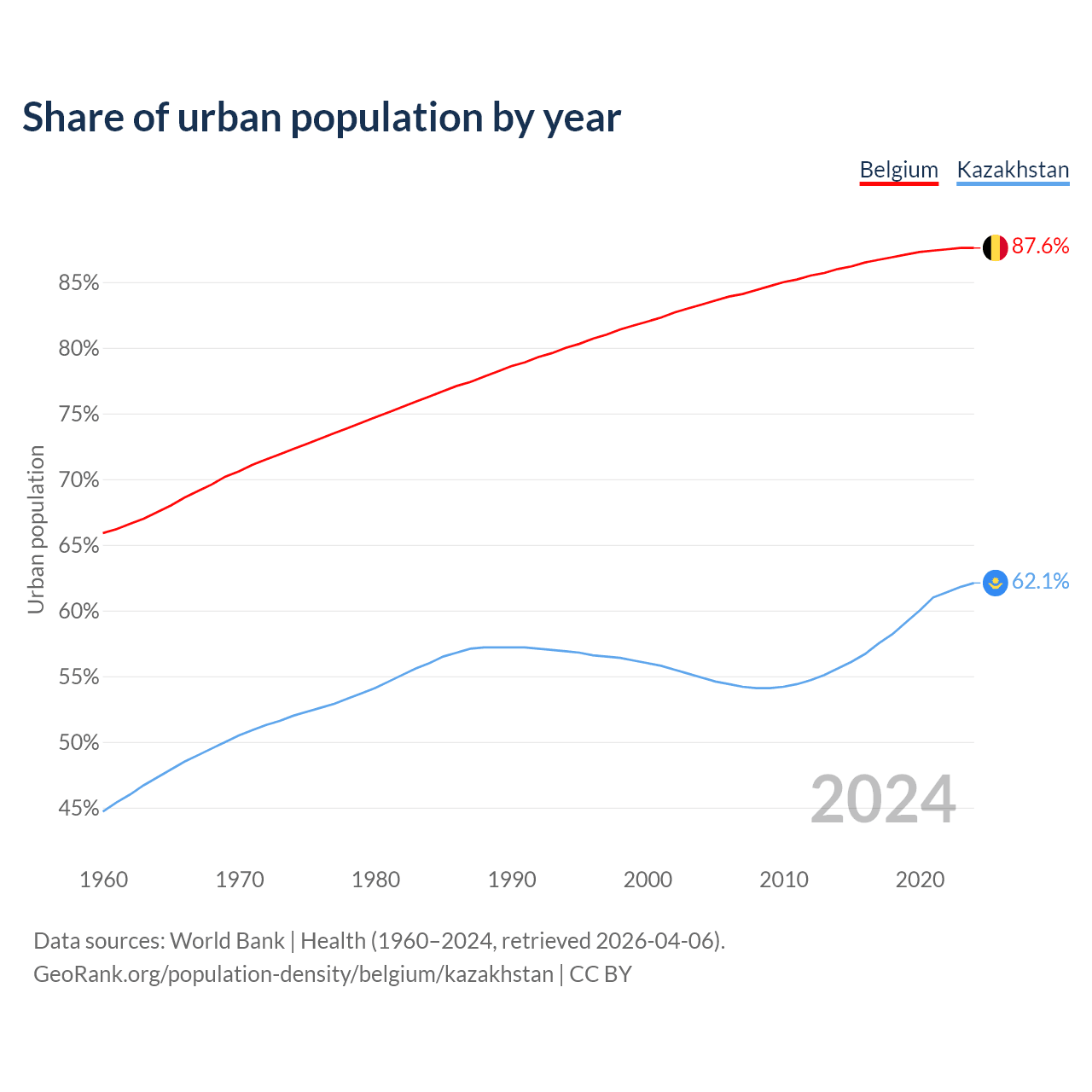 From 2004 to 2024, the share of urban population changed from 83.3% to 87.6% in Belgium and from 54.9% to 62.1% in Kazakhstan.