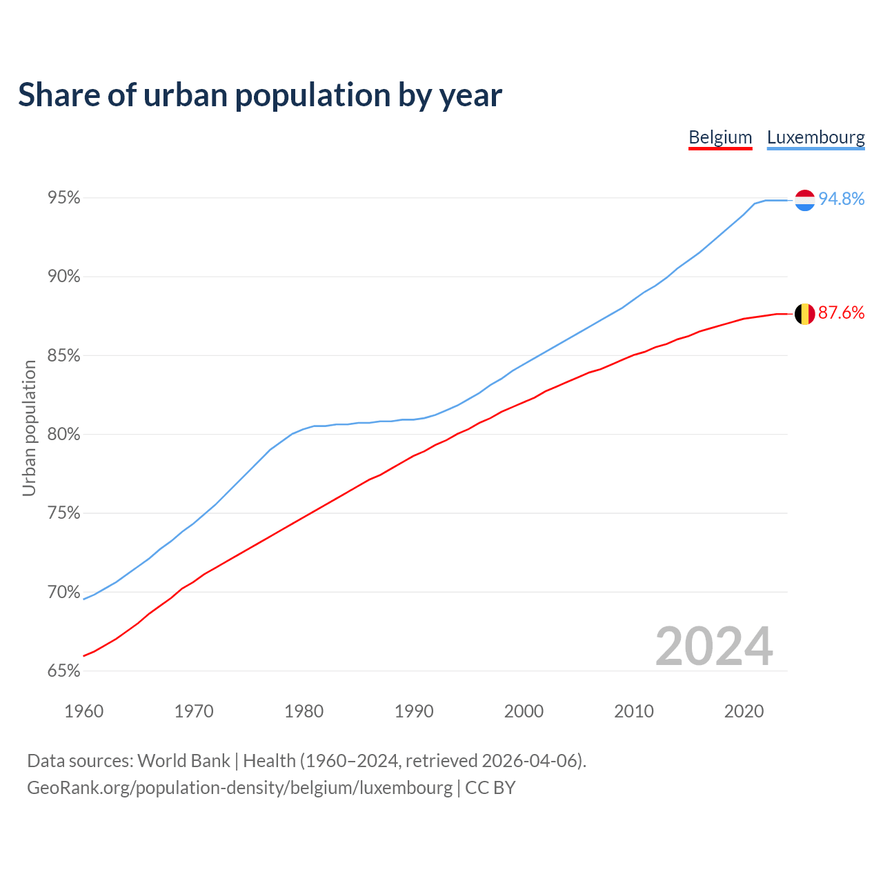From 2004 to 2024, the share of urban population changed from 83.3% to 87.6% in Belgium and from 86% to 94.8% in Luxembourg.