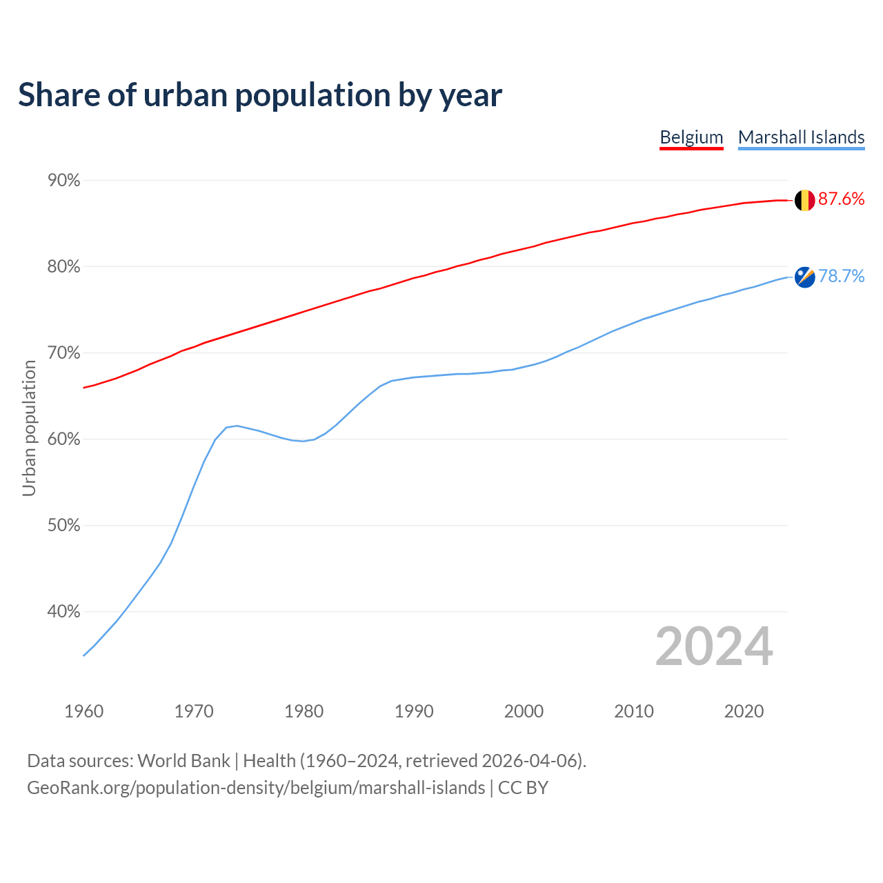 From 2004 to 2024, the share of urban population changed from 83.3% to 87.6% in Belgium and from 70.1% to 78.7% in the Marshall Islands.