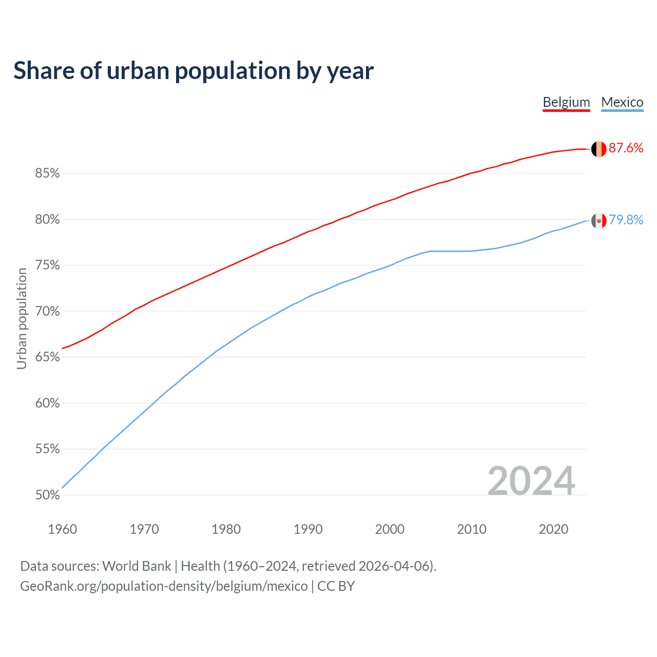 From 2004 to 2024, the share of urban population changed from 83.3% to 87.6% in Belgium and from 76.3% to 79.8% in Mexico.