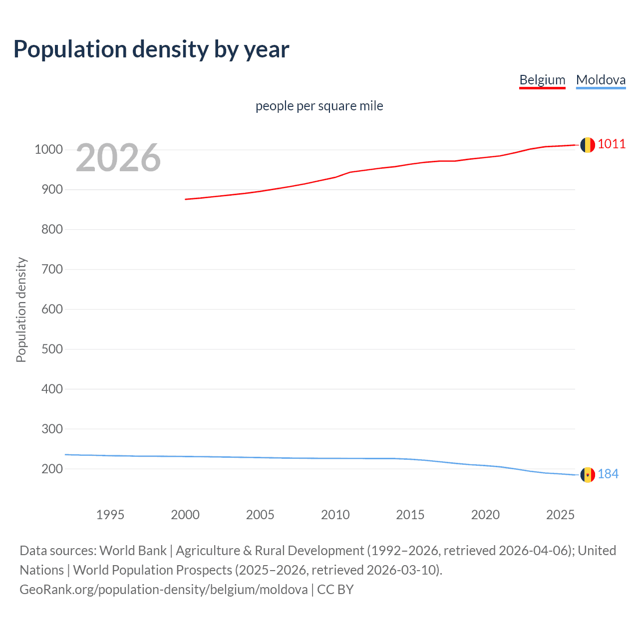 From 2006 to 2026, population density in Belgium increased by 12.2%, compared to a 18.8% decline in Moldova.