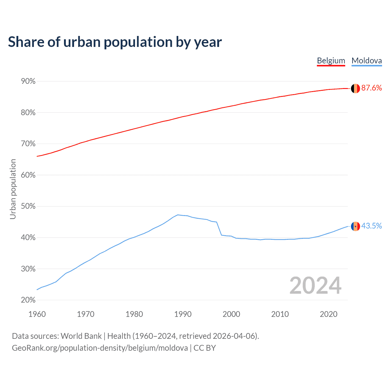 From 2004 to 2024, the share of urban population changed from 83.3% to 87.6% in Belgium and from 39.4% to 43.5% in Moldova.