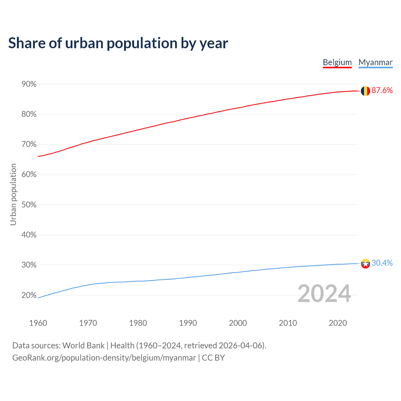 From 2004 to 2024, the share of urban population changed from 83.3% to 87.6% in Belgium and from 28.2% to 30.4% in Myanmar.