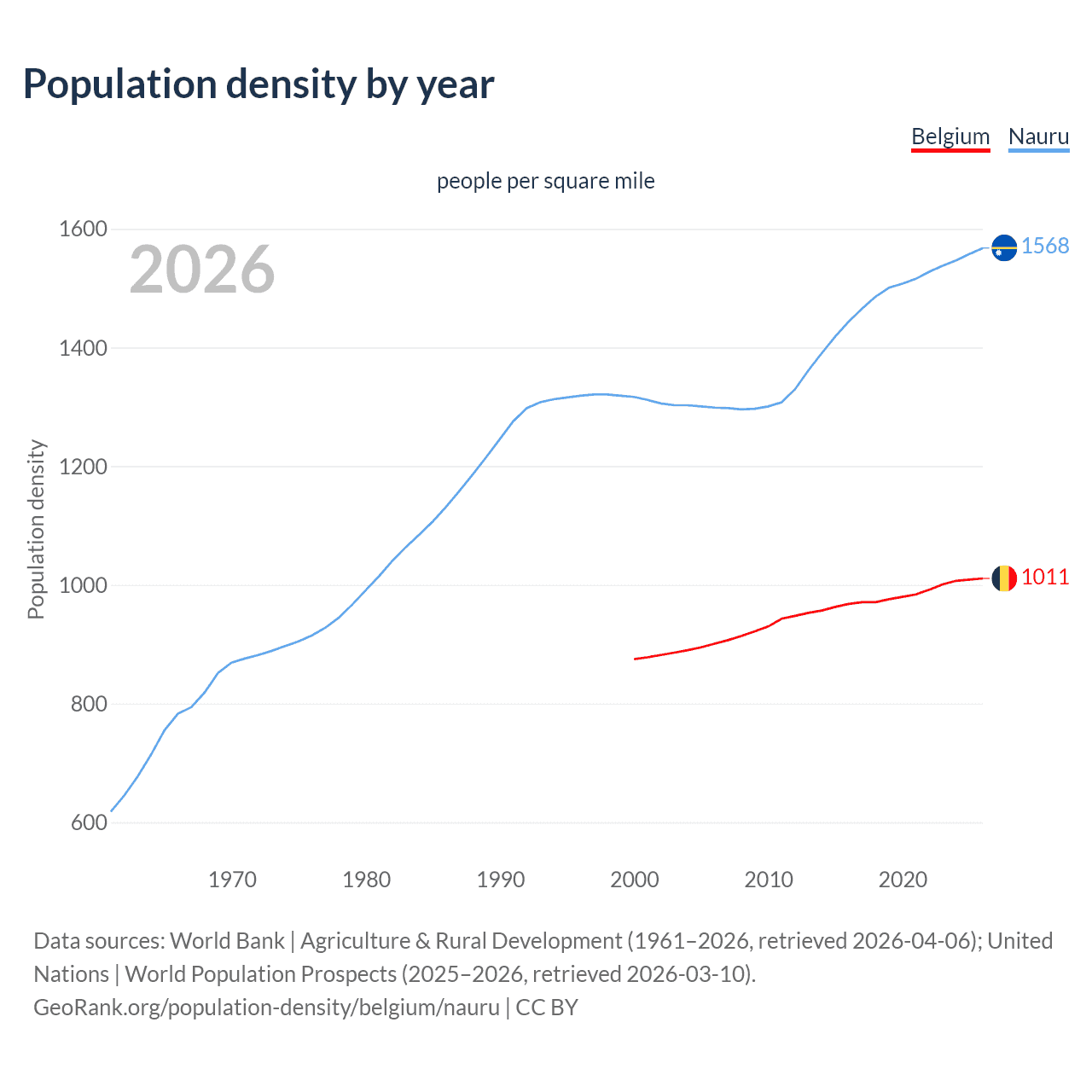 From 2006 to 2026, population density in Belgium increased by 12.2%, compared to a 20.6% growth in Nauru.