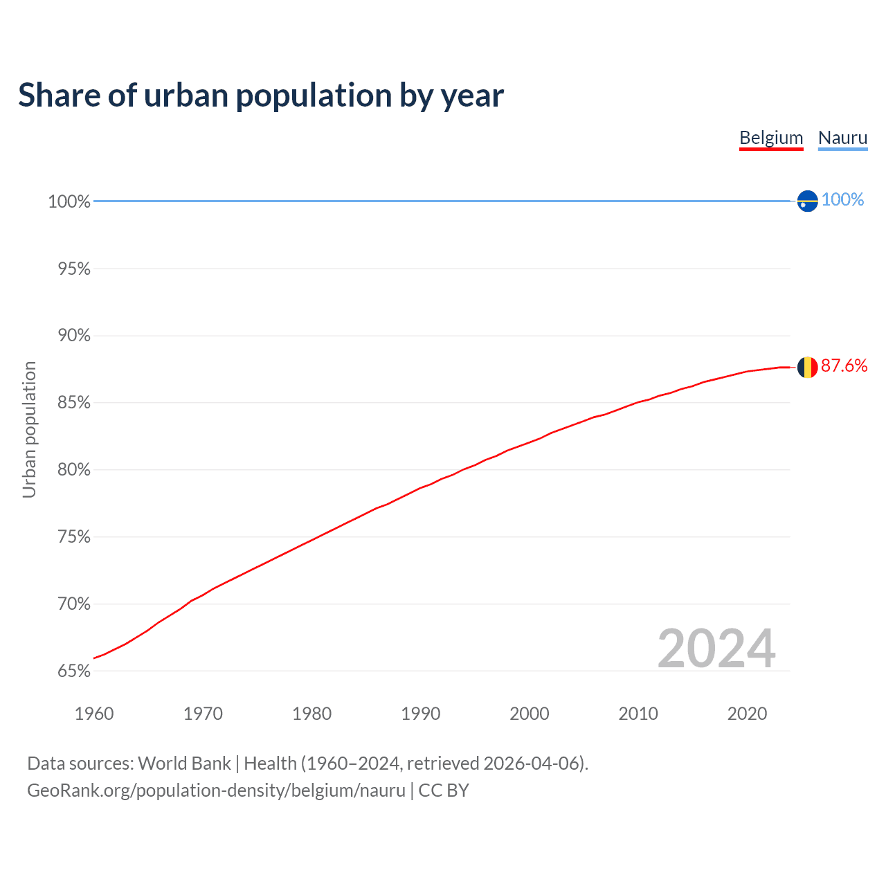From 2004 to 2024, the share of urban population changed from 83.3% to 87.6% in Belgium and from 100% to 100% in Nauru.