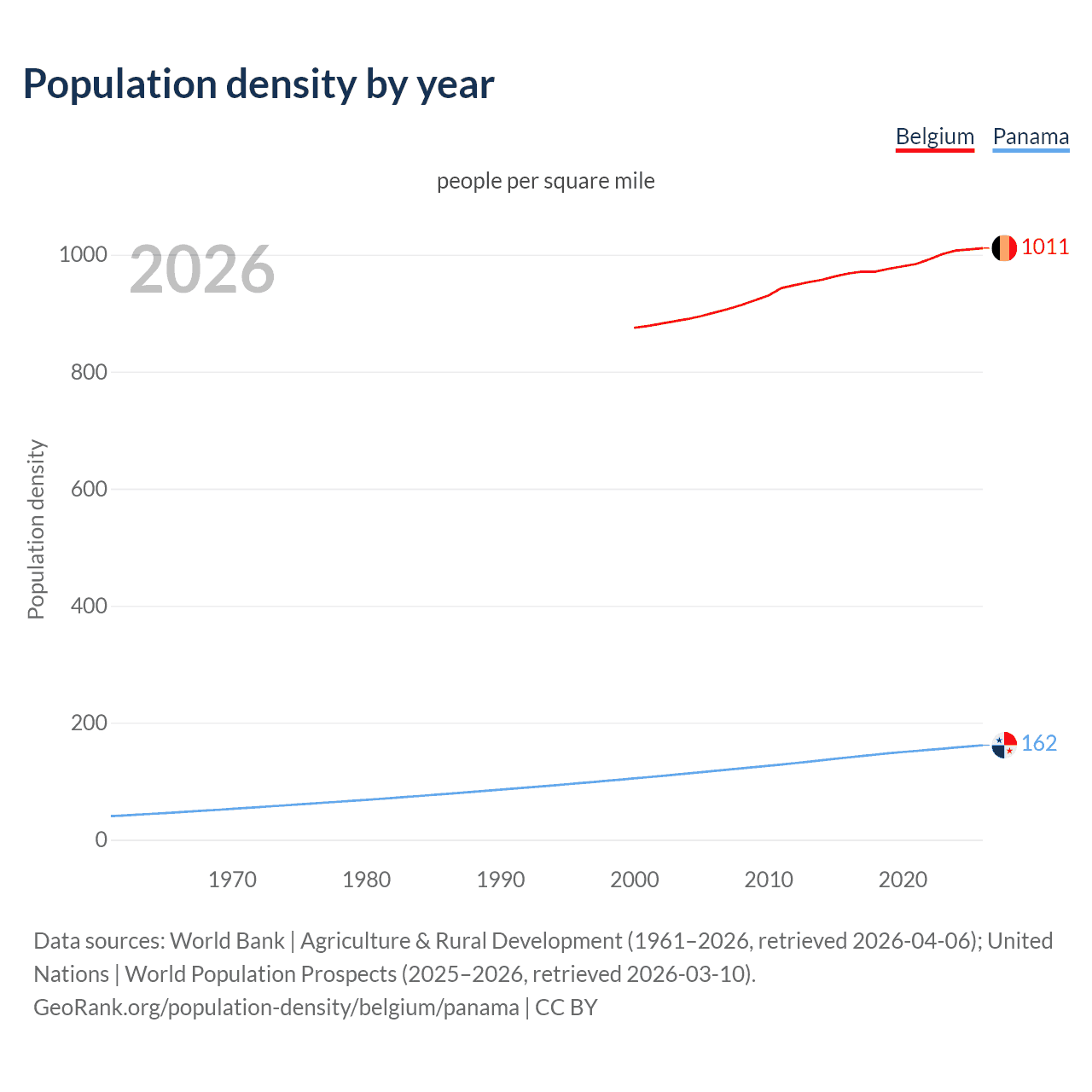 From 2006 to 2026, population density in Belgium increased by 12.2%, compared to a 37.4% growth in Panama.