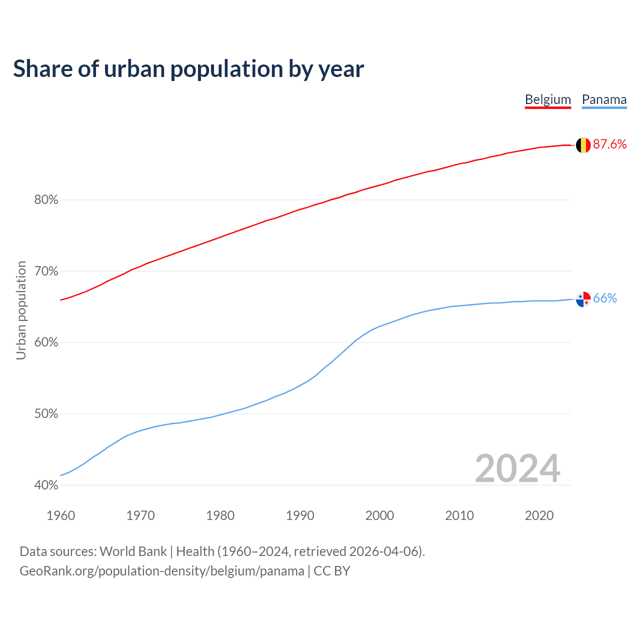 From 2004 to 2024, the share of urban population changed from 83.3% to 87.6% in Belgium and from 63.8% to 66% in Panama.