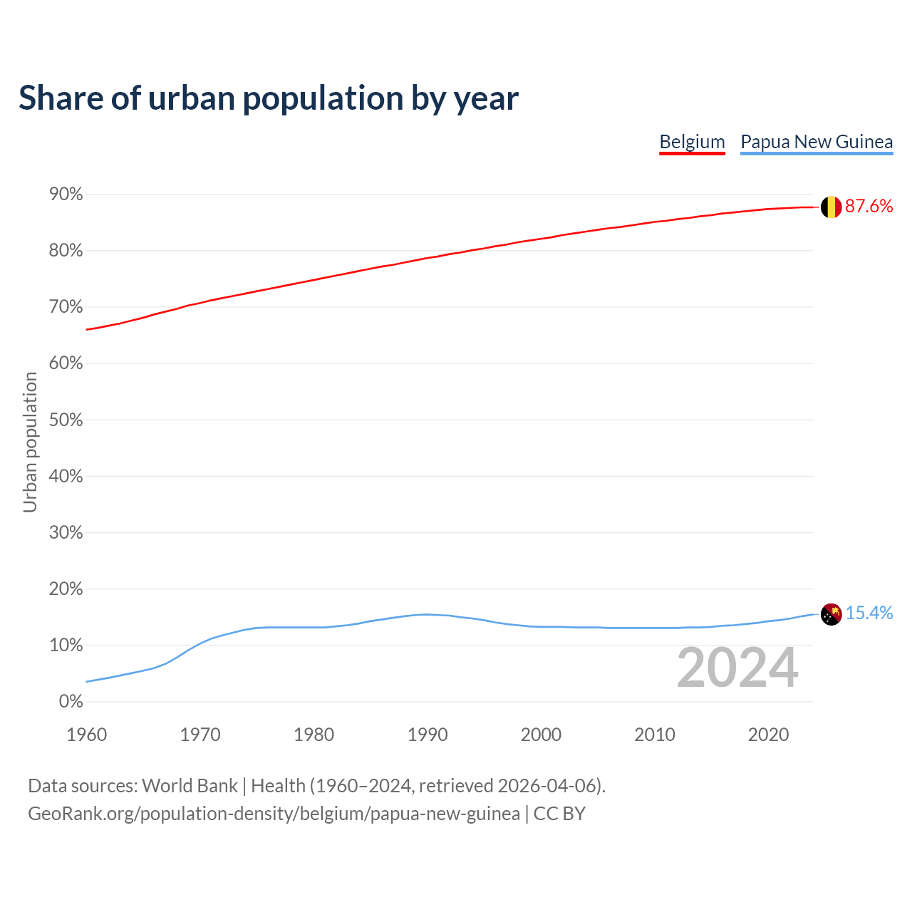 From 2004 to 2024, the share of urban population changed from 83.3% to 87.6% in Belgium and from 13.1% to 15.4% in Papua New Guinea.