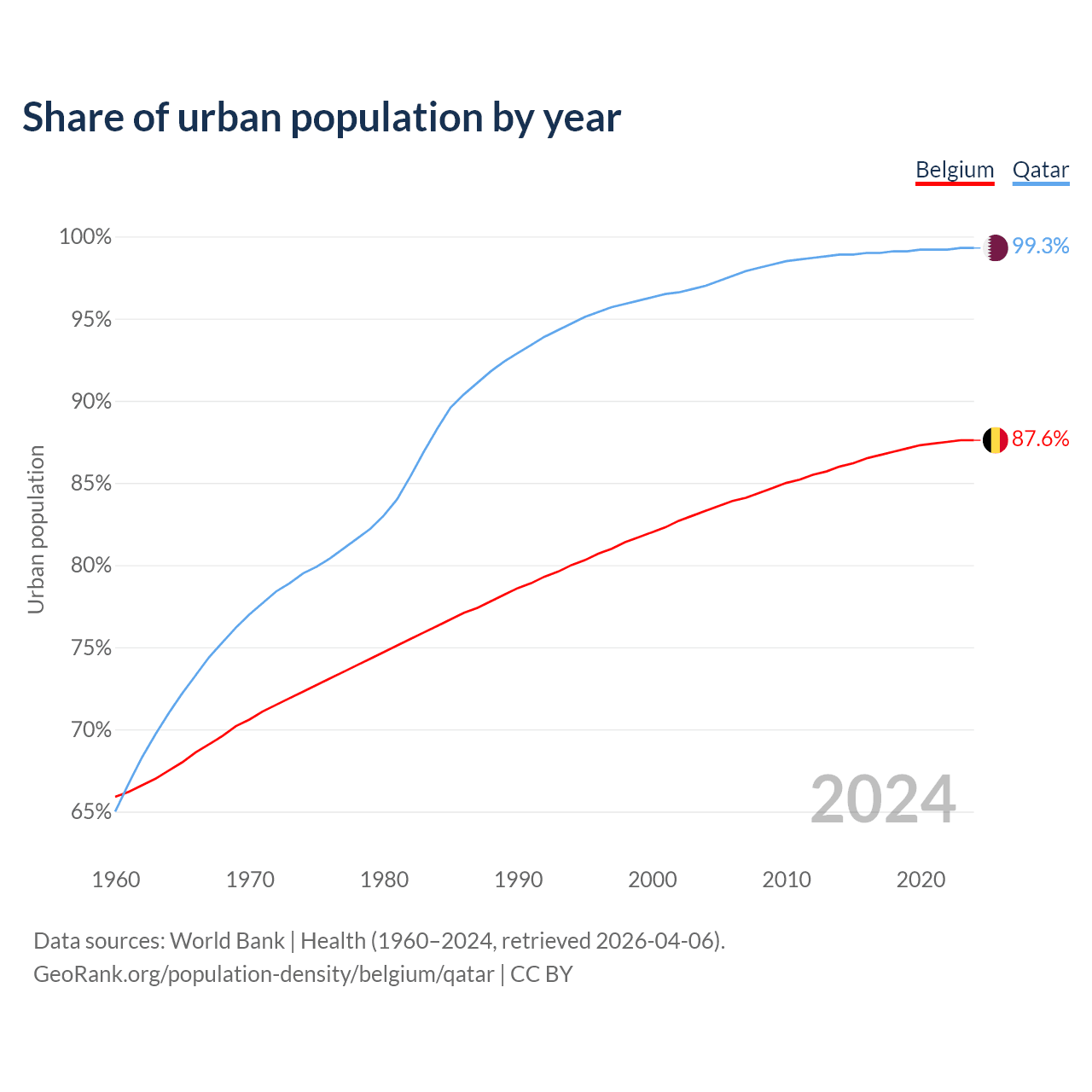 From 2004 to 2024, the share of urban population changed from 83.3% to 87.6% in Belgium and from 97% to 99.3% in Qatar.