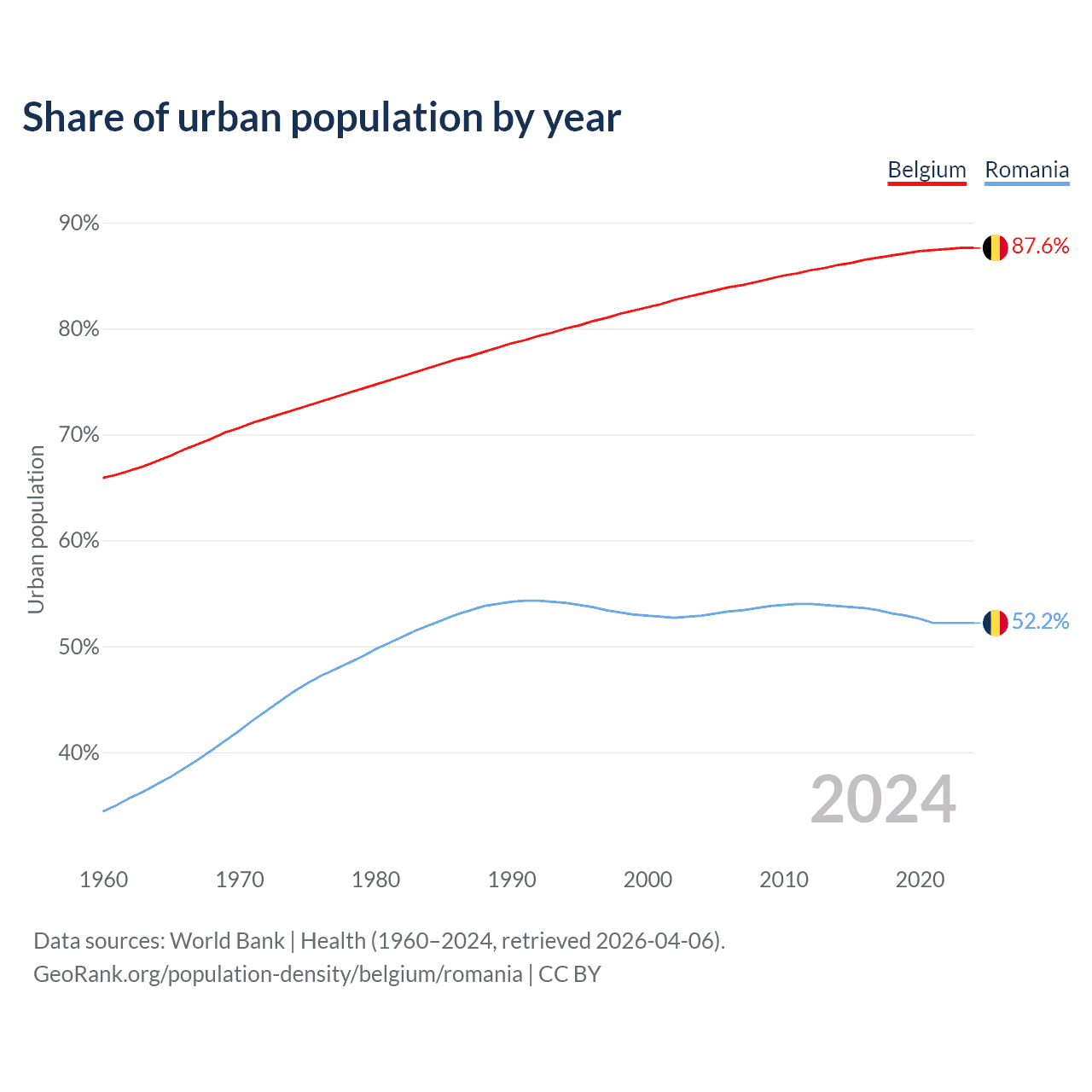 From 2004 to 2024, the share of urban population changed from 83.3% to 87.6% in Belgium and from 52.9% to 52.2% in Romania.