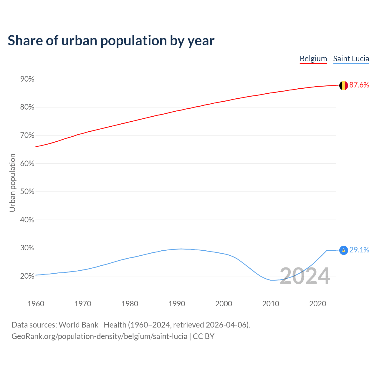 From 2004 to 2024, the share of urban population changed from 83.3% to 87.6% in Belgium and from 24.8% to 29.1% in Saint Lucia.