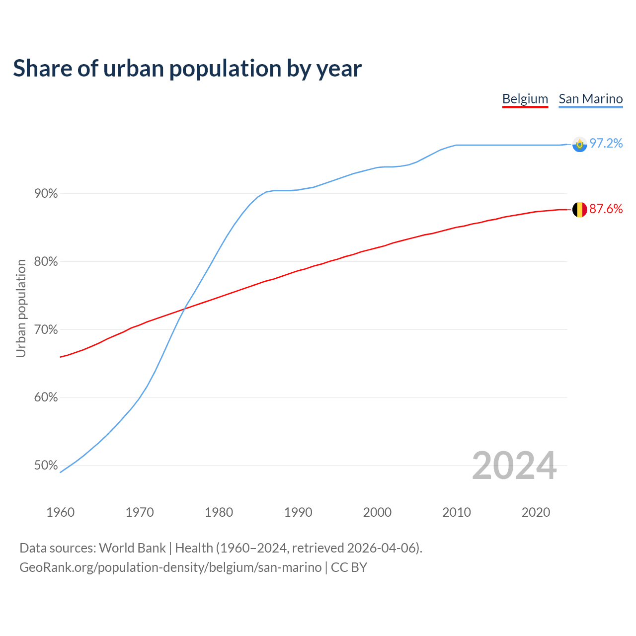 From 2004 to 2024, the share of urban population changed from 83.3% to 87.6% in Belgium and from 94.2% to 97.2% in San Marino.