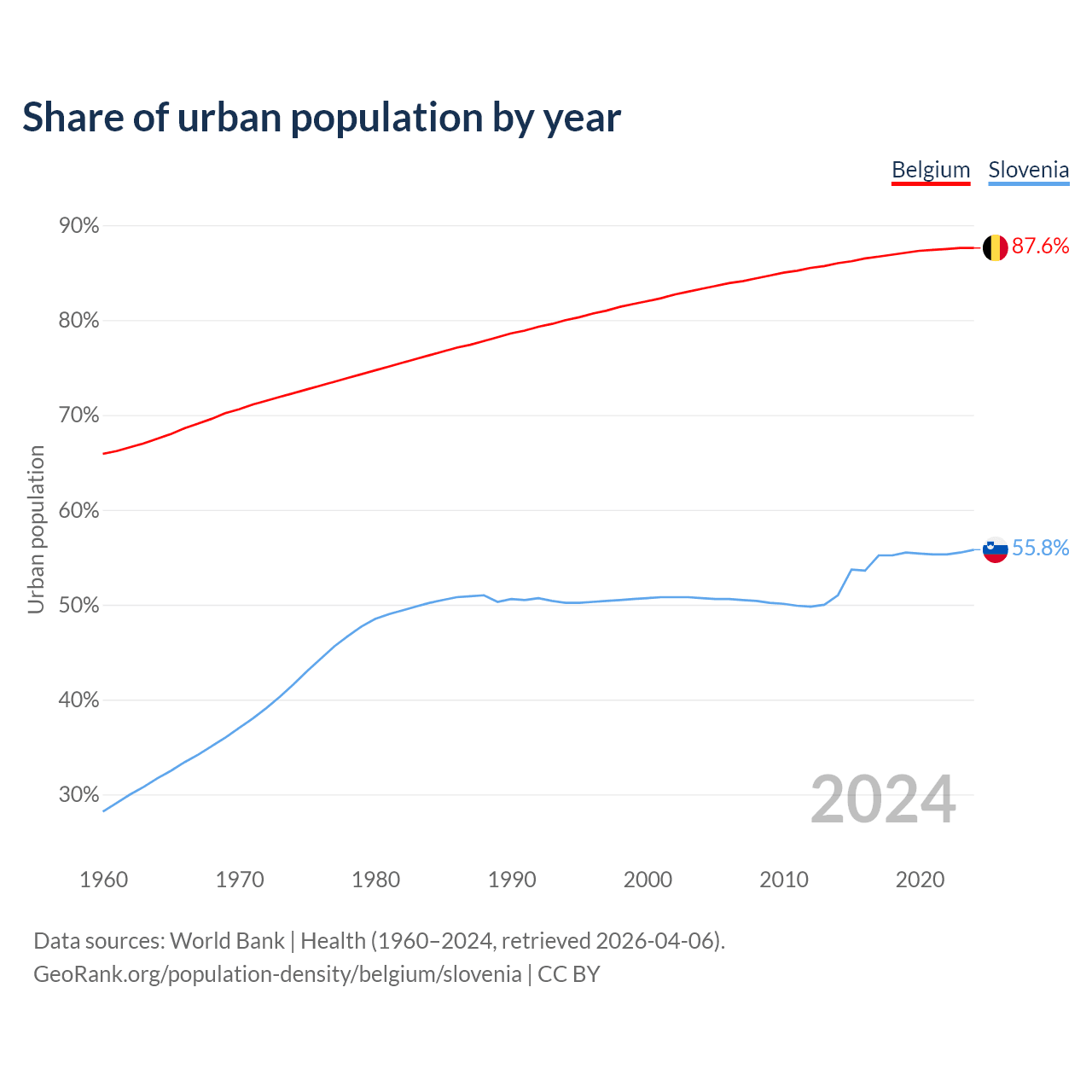 From 2004 to 2024, the share of urban population changed from 83.3% to 87.6% in Belgium and from 50.7% to 55.8% in Slovenia.