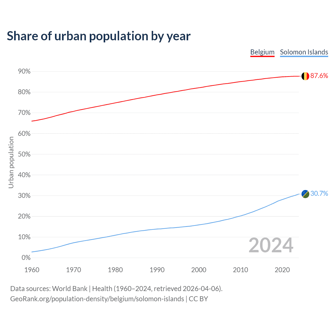 From 2004 to 2024, the share of urban population changed from 83.3% to 87.6% in Belgium and from 17.2% to 30.7% in the Solomon Islands.