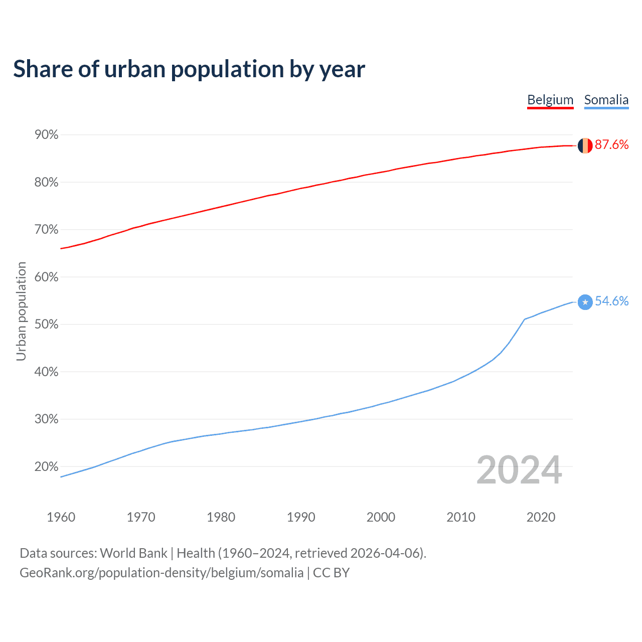 From 2004 to 2024, the share of urban population changed from 83.3% to 87.6% in Belgium and from 35% to 54.6% in Somalia.