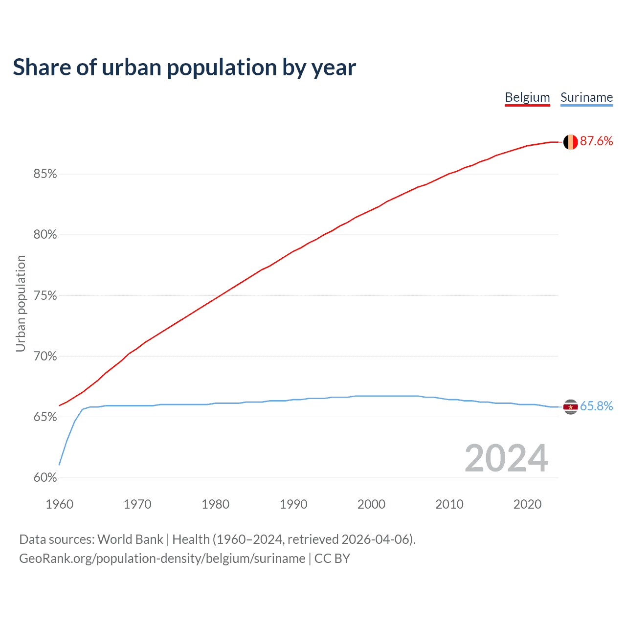 From 2004 to 2024, the share of urban population changed from 83.3% to 87.6% in Belgium and from 66.7% to 65.8% in Suriname.