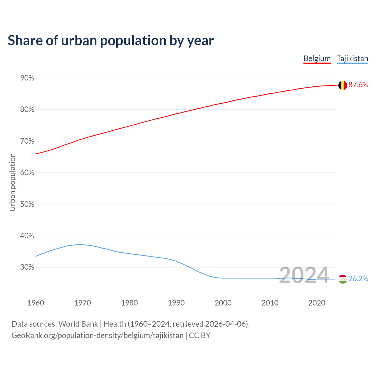 From 2004 to 2024, the share of urban population changed from 83.3% to 87.6% in Belgium and from 26.5% to 26.2% in Tajikistan.