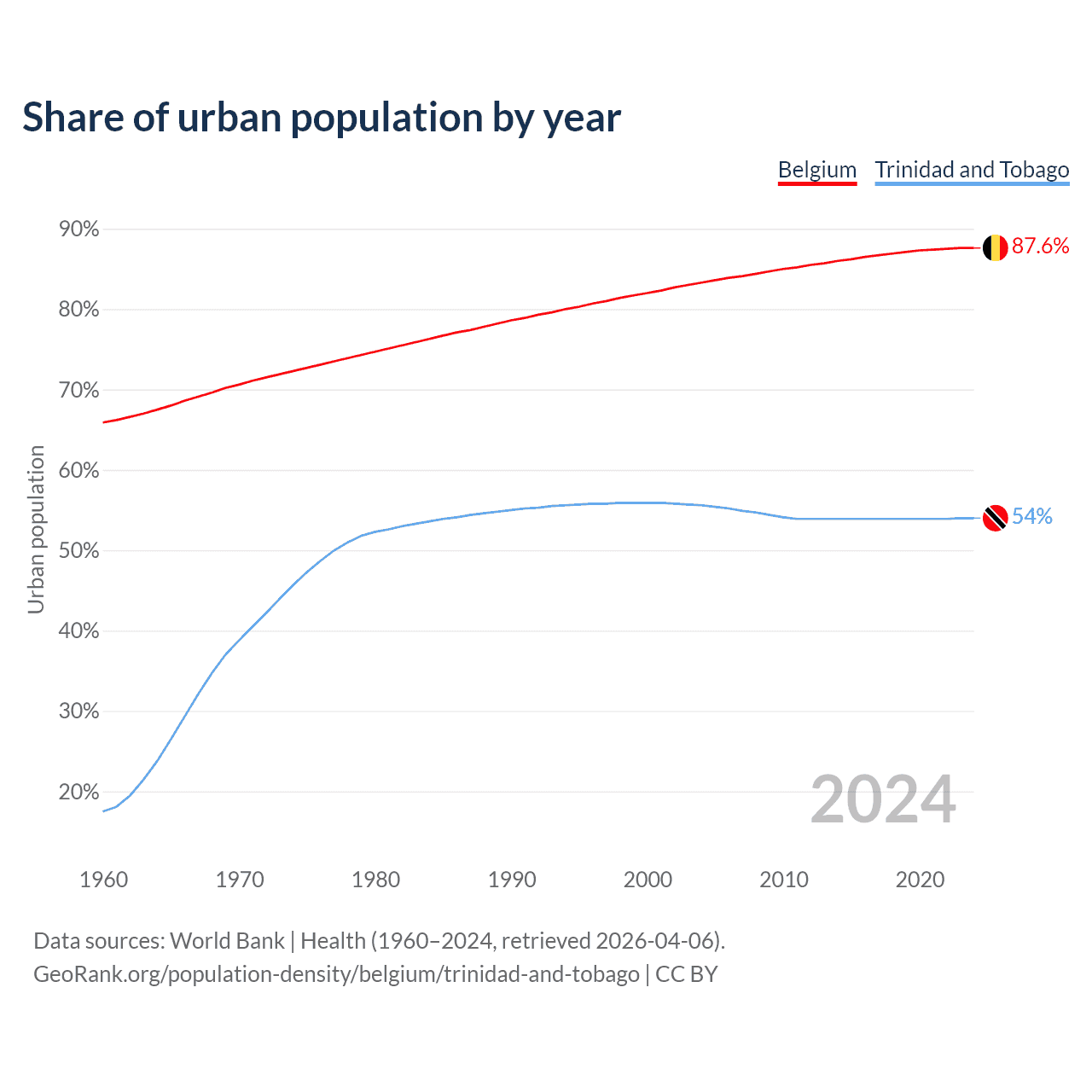 From 2004 to 2024, the share of urban population changed from 83.3% to 87.6% in Belgium and from 55.6% to 54% in Trinidad and Tobago.