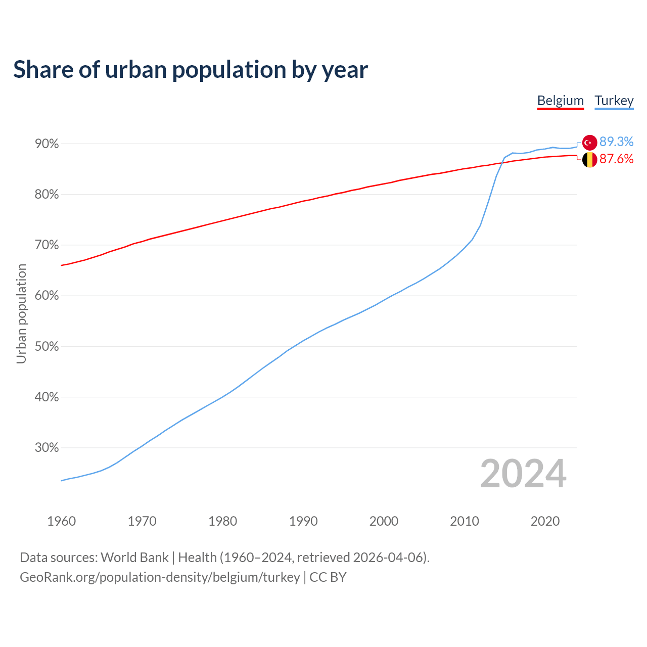 From 2004 to 2024, the share of urban population changed from 83.3% to 87.6% in Belgium and from 62.4% to 89.3% in Turkey.