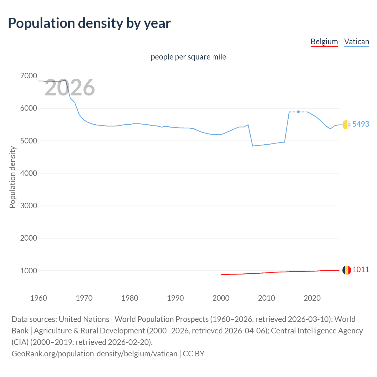 From 2006 to 2026, population density in Belgium increased by 12.2%, compared to a 0.13% growth in the Vatican.