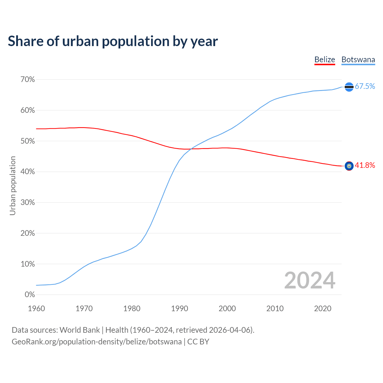 From 2004 to 2024, the share of urban population changed from 47% to 41.8% in Belize and from 57.3% to 67.5% in Botswana.