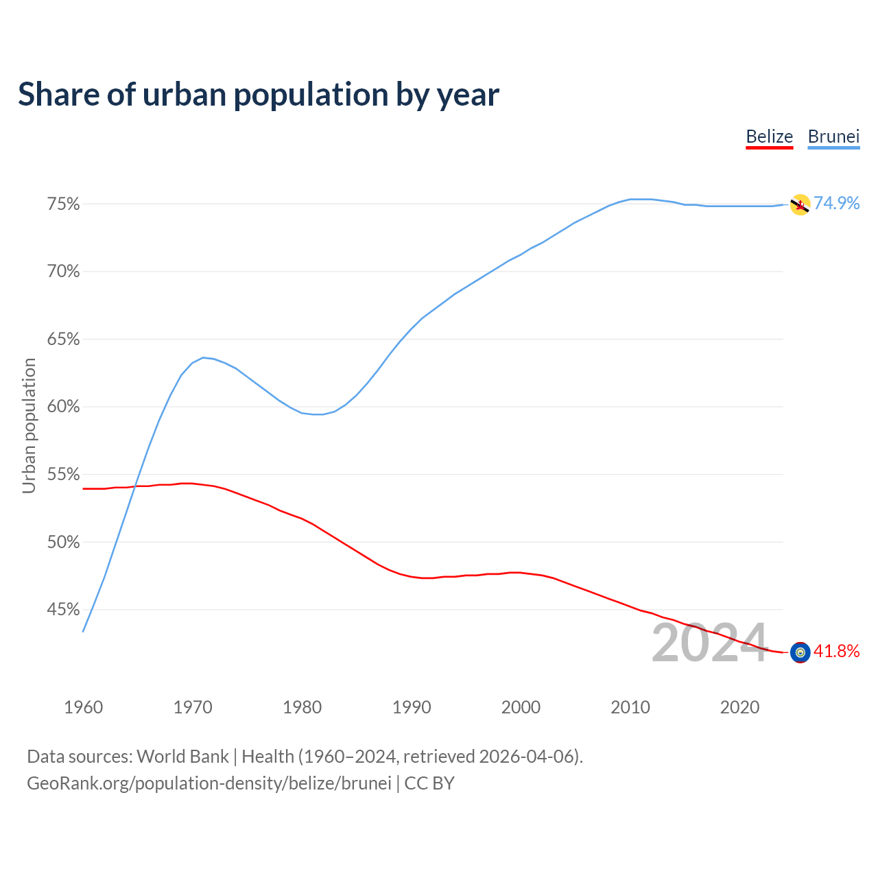 From 2004 to 2024, the share of urban population changed from 47% to 41.8% in Belize and from 73.1% to 74.9% in Brunei.