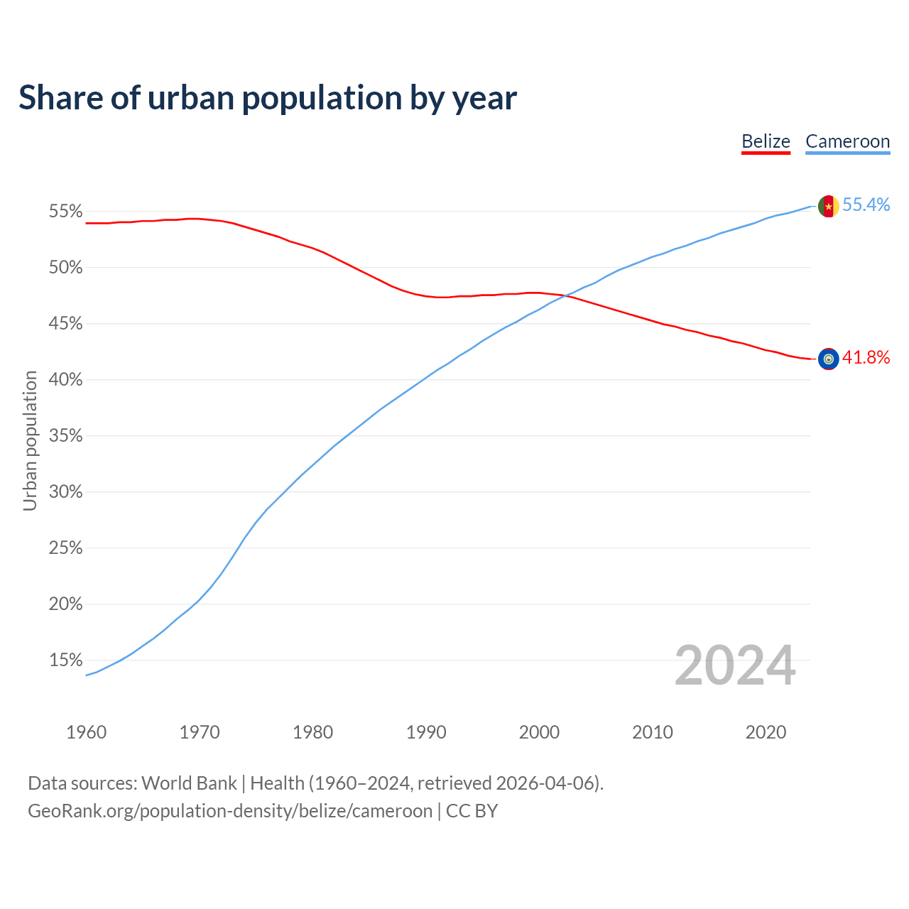 From 2004 to 2024, the share of urban population changed from 47% to 41.8% in Belize and from 48.2% to 55.4% in Cameroon.