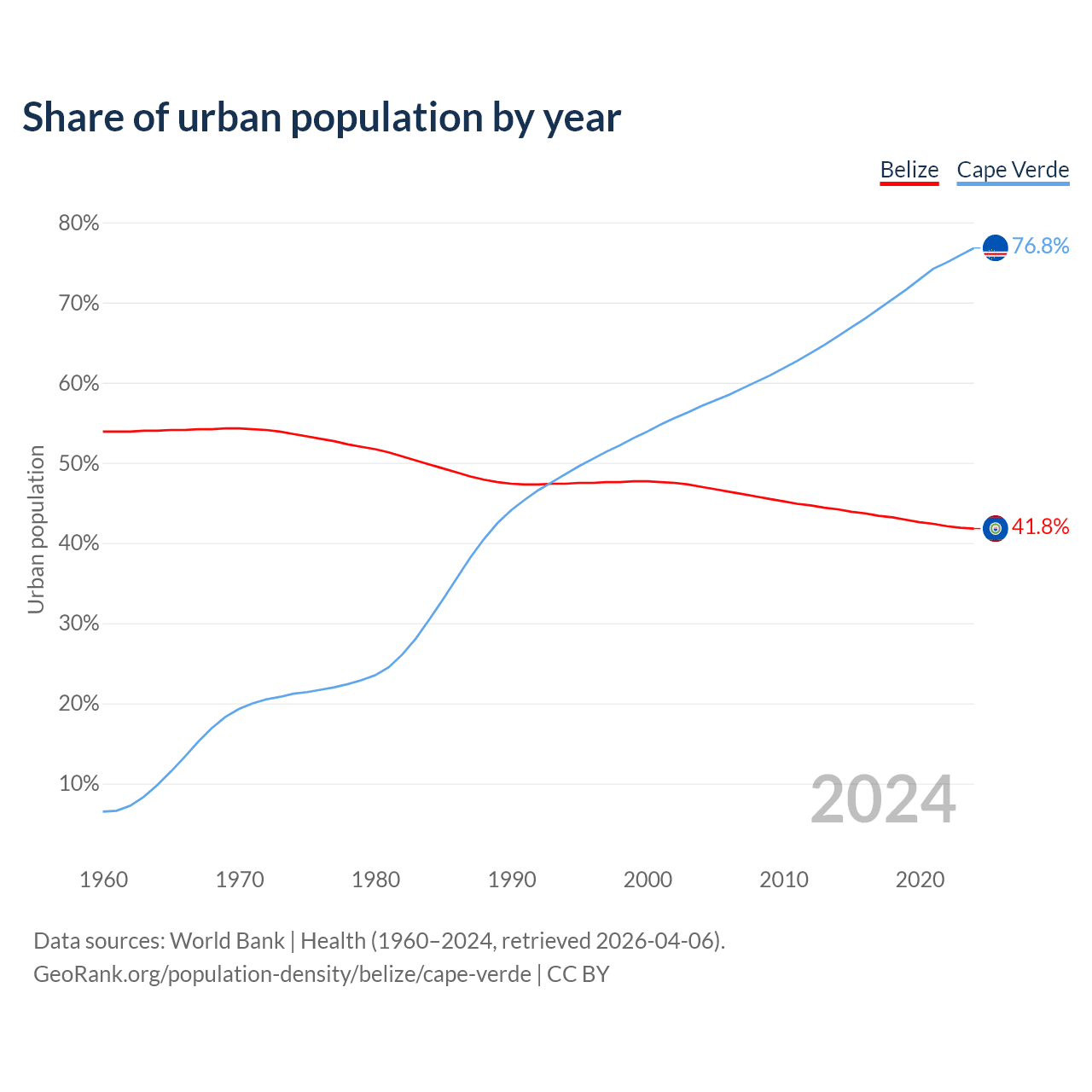 From 2004 to 2024, the share of urban population changed from 47% to 41.8% in Belize and from 57.1% to 76.8% in Cape Verde.