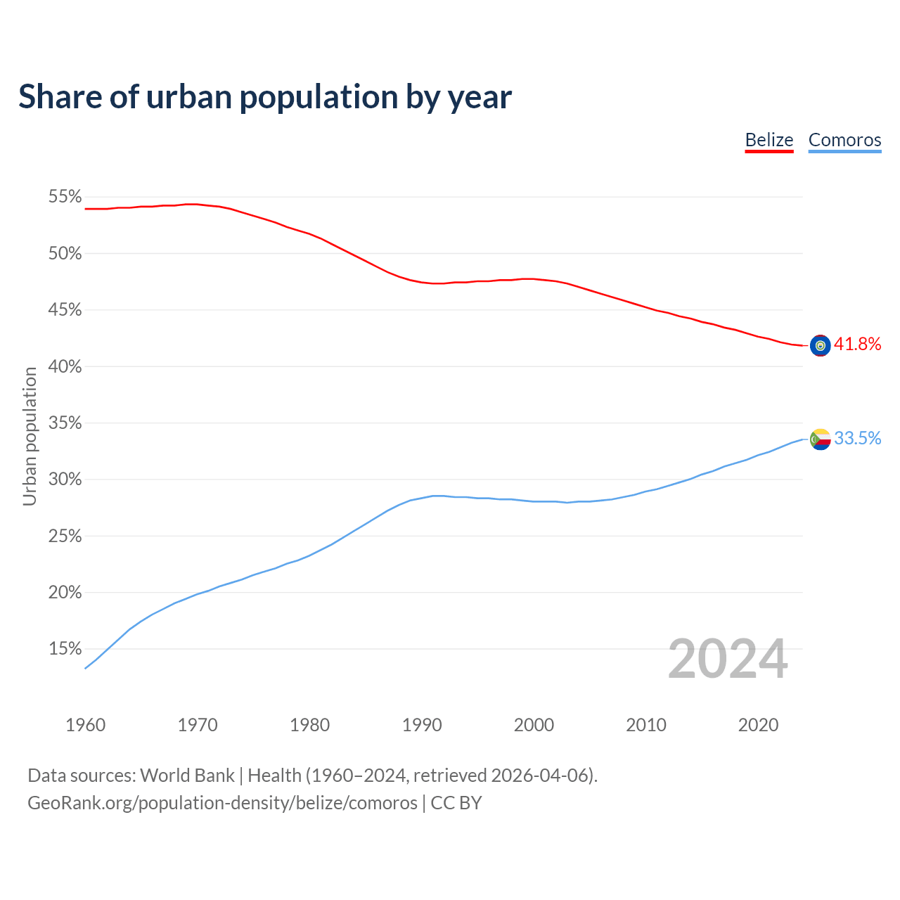 From 2004 to 2024, the share of urban population changed from 47% to 41.8% in Belize and from 28% to 33.5% in Comoros.