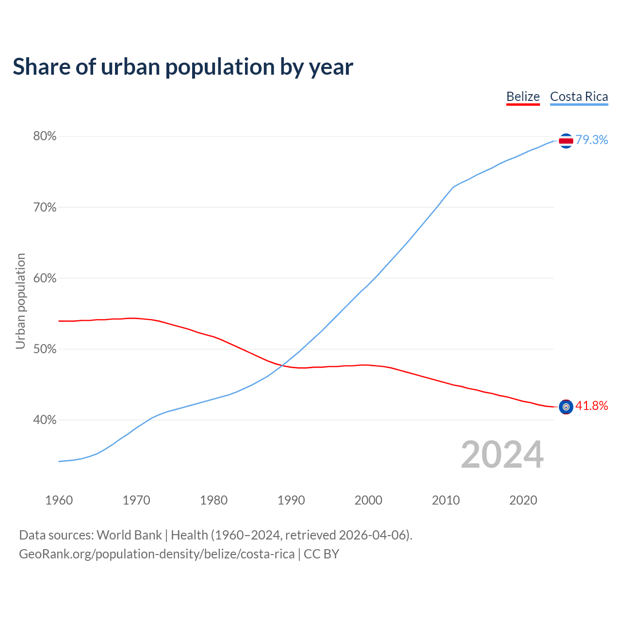 From 2004 to 2024, the share of urban population changed from 47% to 41.8% in Belize and from 63.7% to 79.3% in Costa Rica.