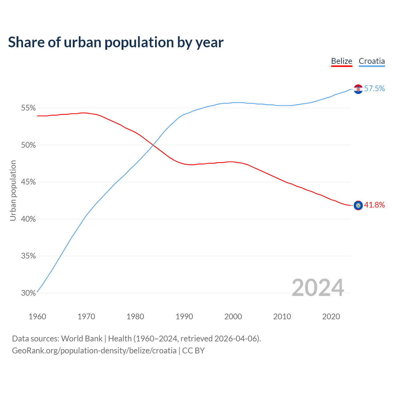 From 2004 to 2024, the share of urban population changed from 47% to 41.8% in Belize and from 55.6% to 57.5% in Croatia.