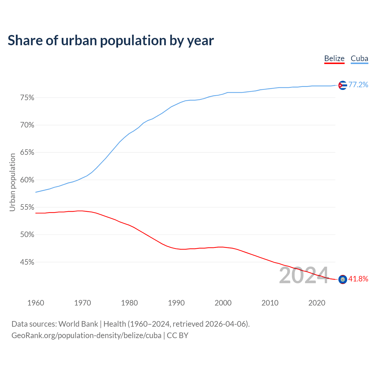 From 2004 to 2024, the share of urban population changed from 47% to 41.8% in Belize and from 75.9% to 77.2% in Cuba.