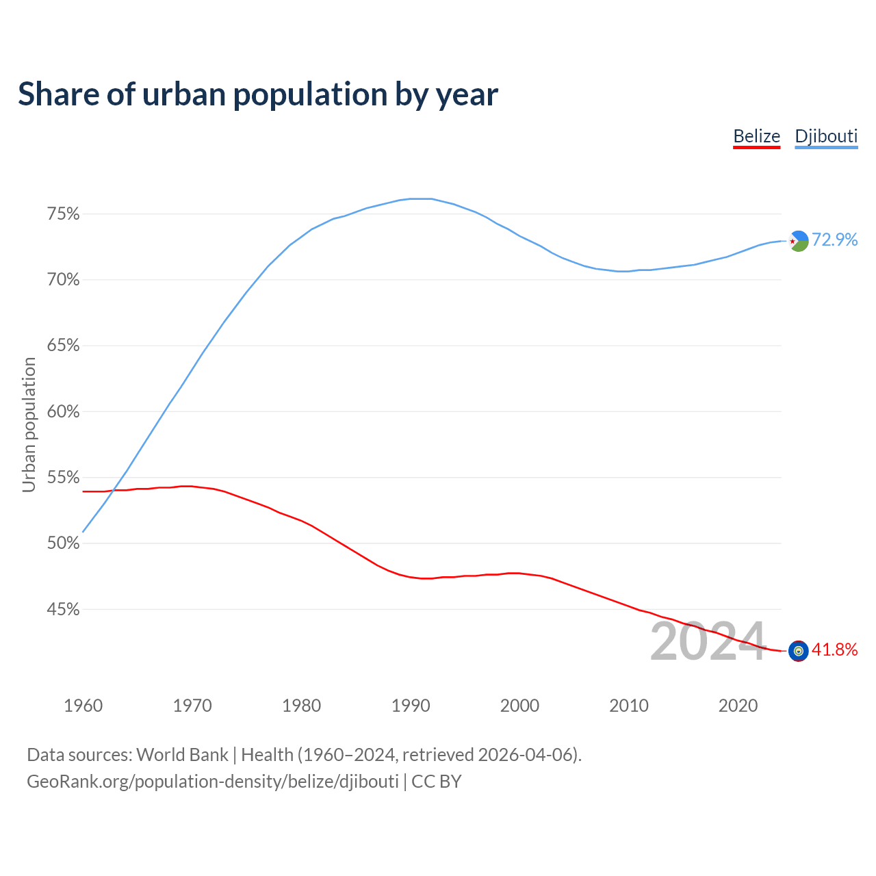 From 2004 to 2024, the share of urban population changed from 47% to 41.8% in Belize and from 71.6% to 72.9% in Djibouti.