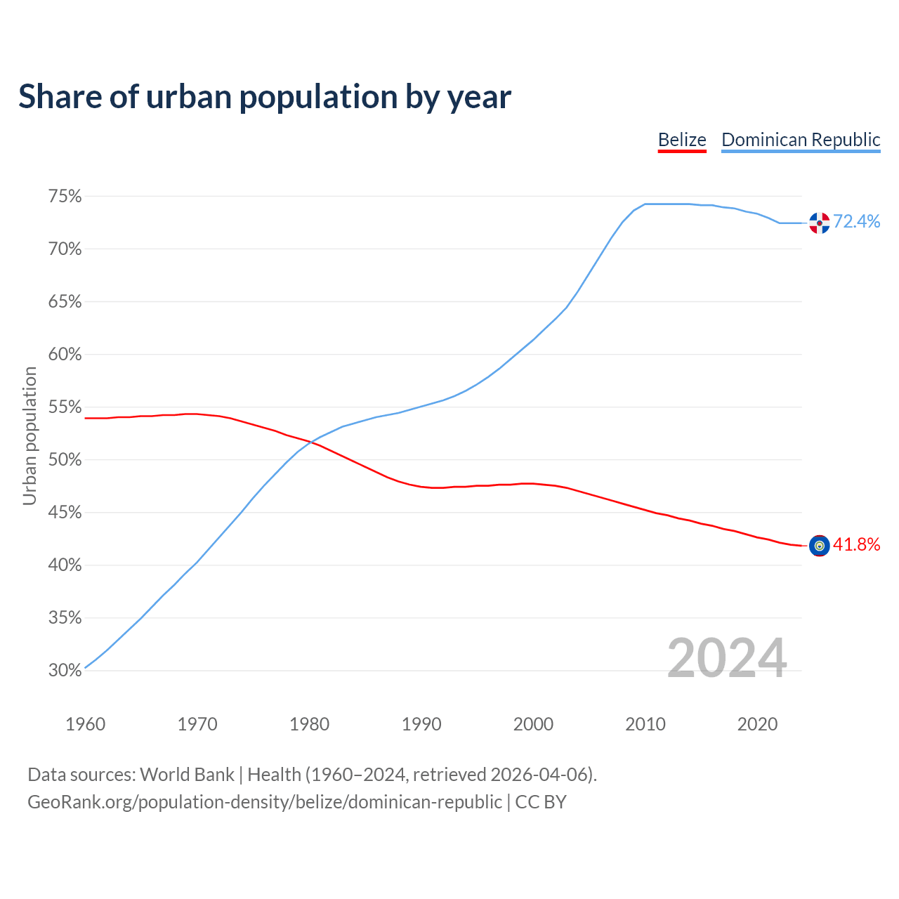 From 2004 to 2024, the share of urban population changed from 47% to 41.8% in Belize and from 65.9% to 72.4% in the Dominican Republic.