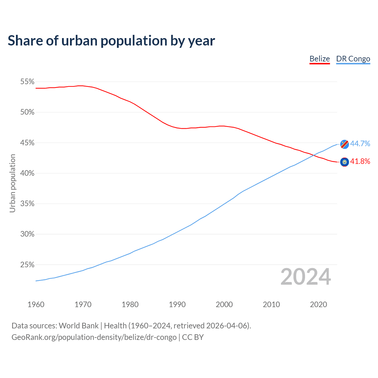 From 2004 to 2024, the share of urban population changed from 47% to 41.8% in Belize and from 37% to 44.7% in the DR Congo.