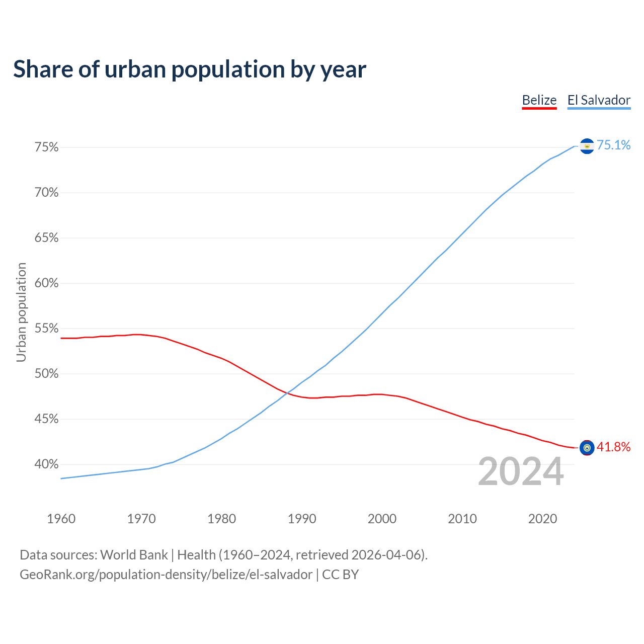 From 2004 to 2024, the share of urban population changed from 47% to 41.8% in Belize and from 60.1% to 75.1% in El Salvador.