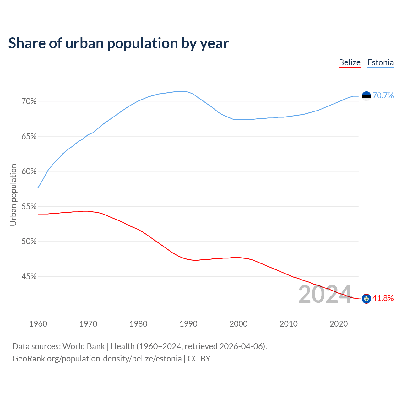 From 2004 to 2024, the share of urban population changed from 47% to 41.8% in Belize and from 67.5% to 70.7% in Estonia.