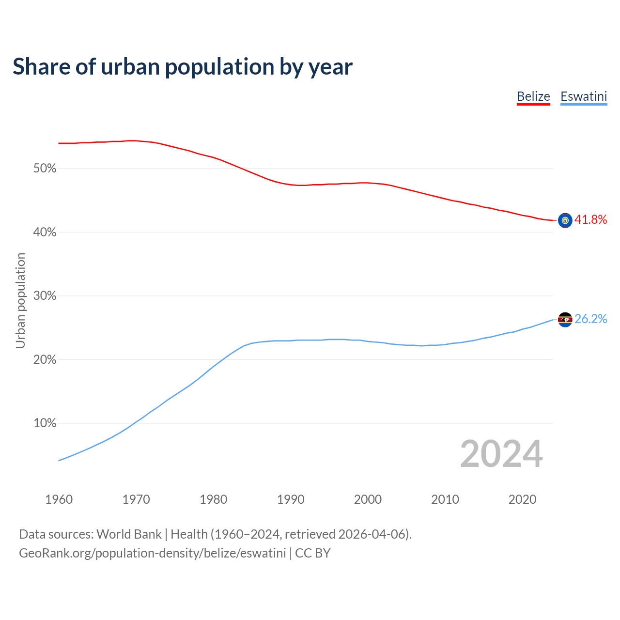 From 2004 to 2024, the share of urban population changed from 47% to 41.8% in Belize and from 22.3% to 26.2% in Eswatini.